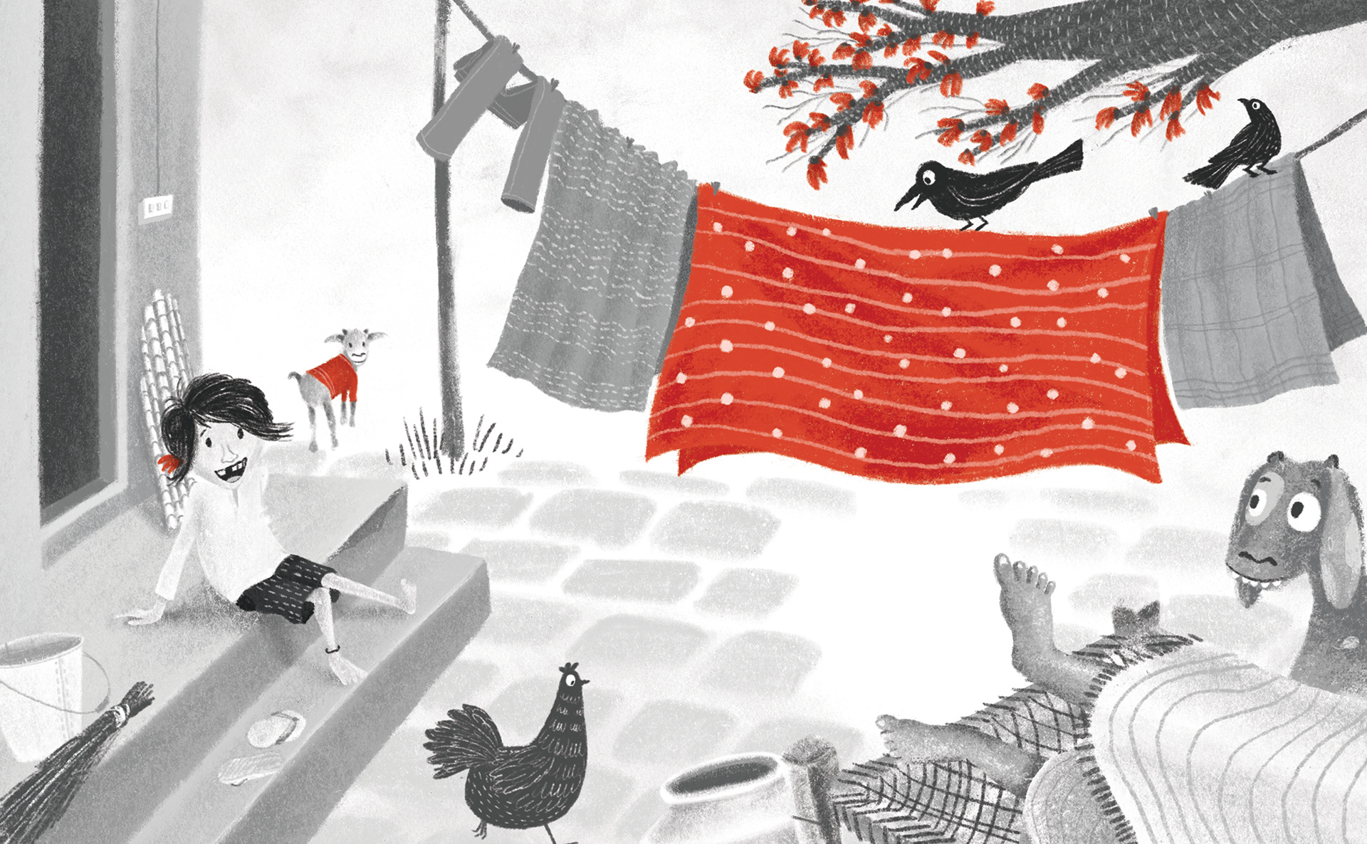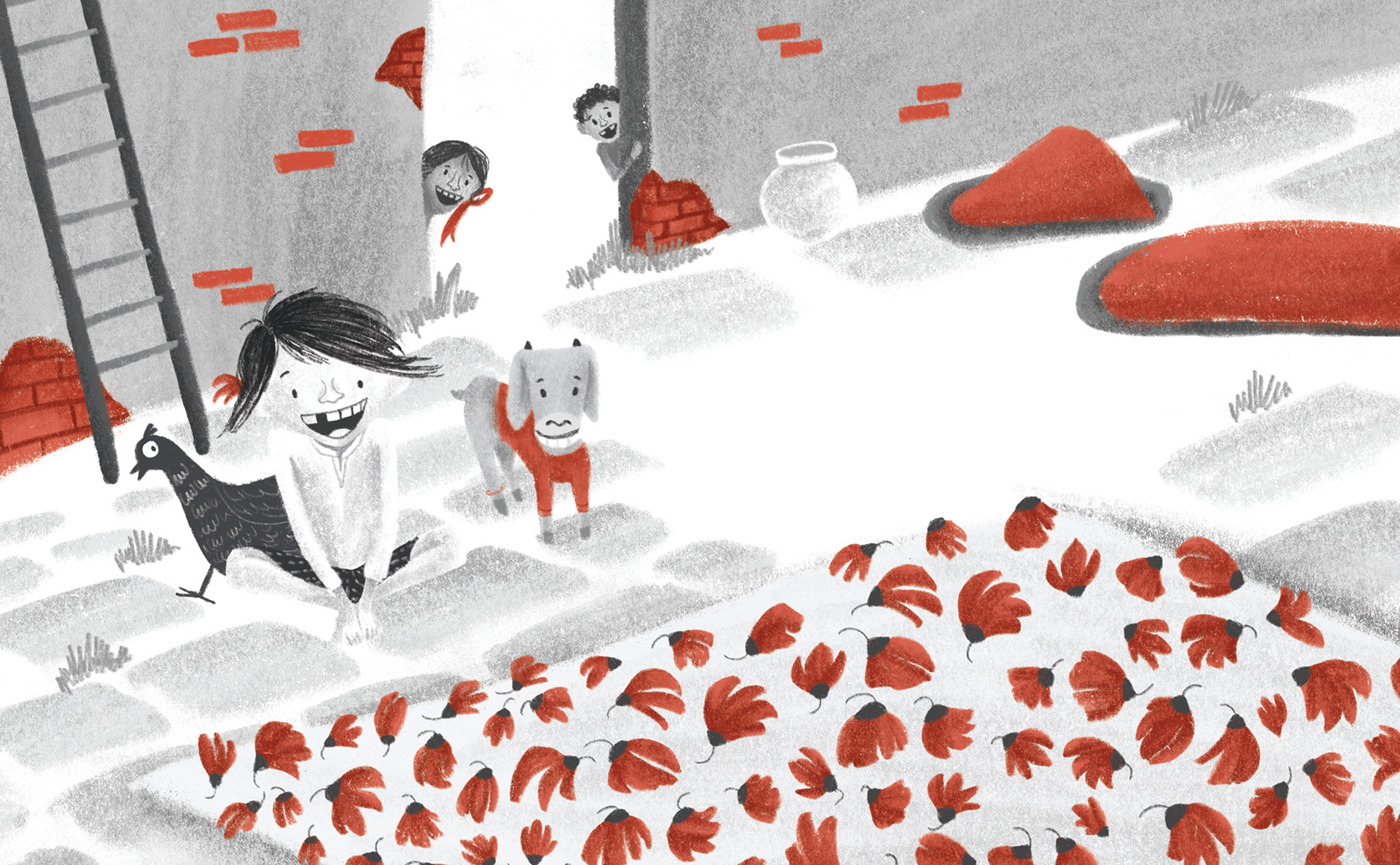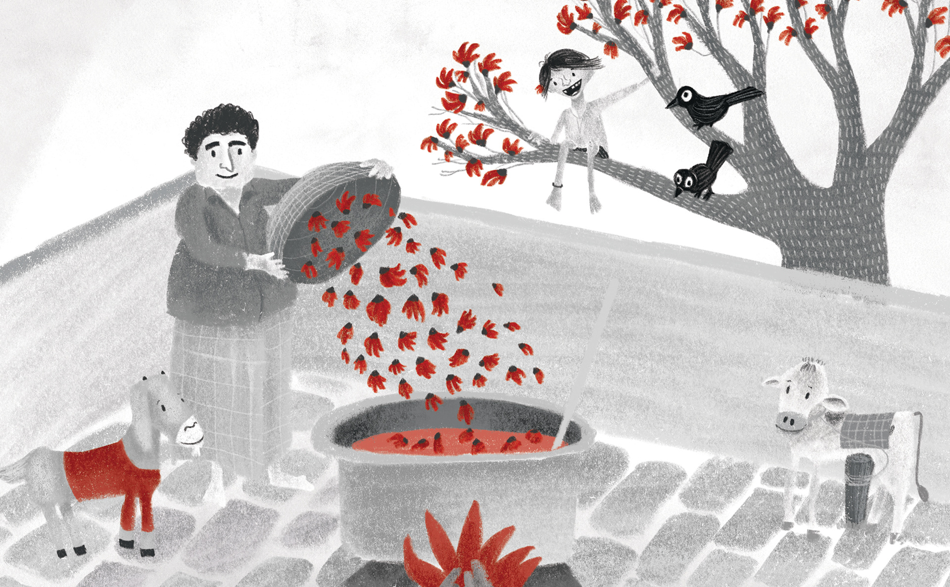 the colour red around him during springtime. For the cover and insides, the colour palette