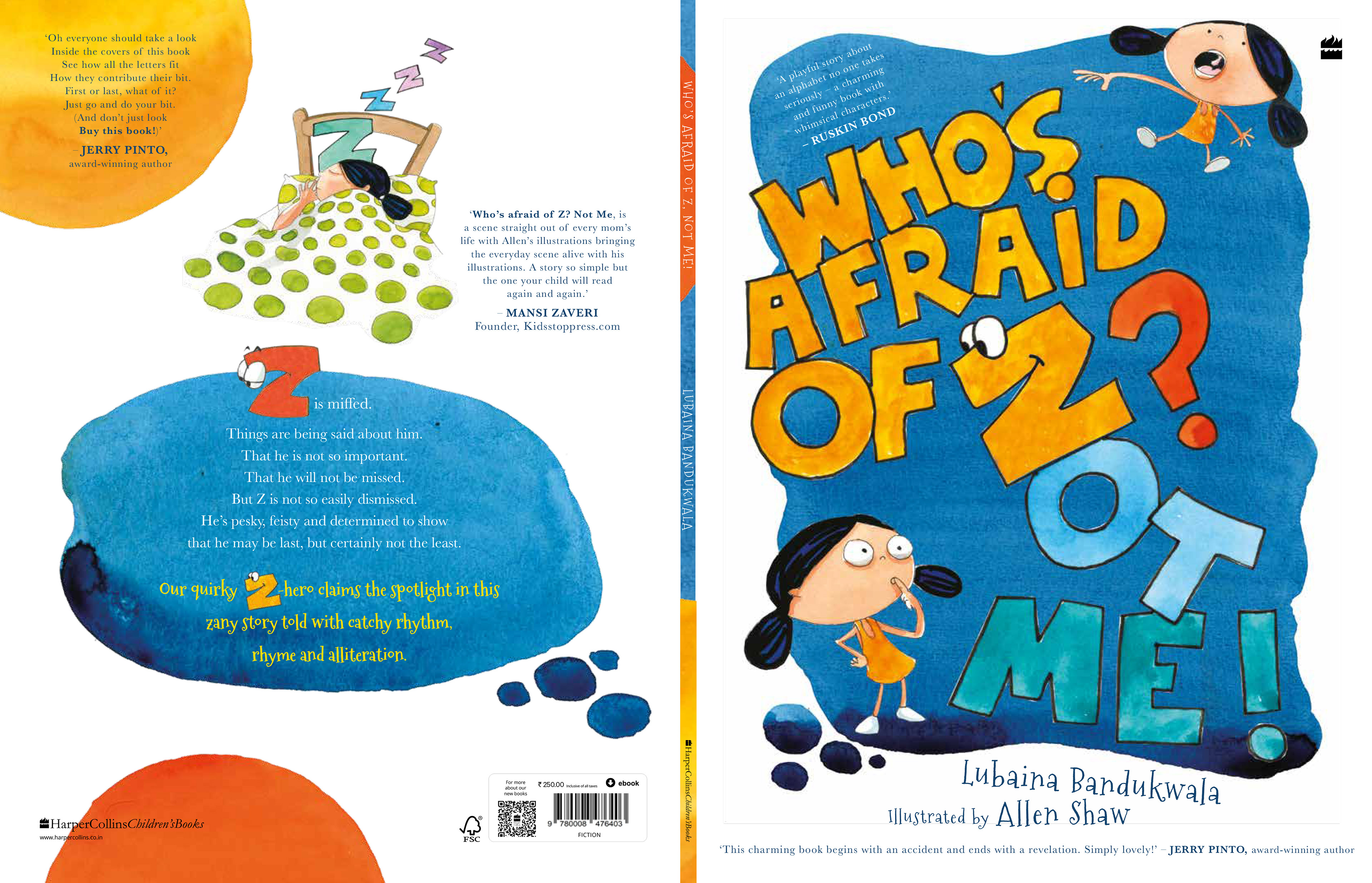 Our quirky Z-hero claims the spotlight in this zany story told with catchy rhythm, rhyme and alliteration. With Allen Shaw's quirky illustrations and Lubaina's rhyming sentences, the design for the cover and the insides were a piece of cake! It is published by HarperCollins India.